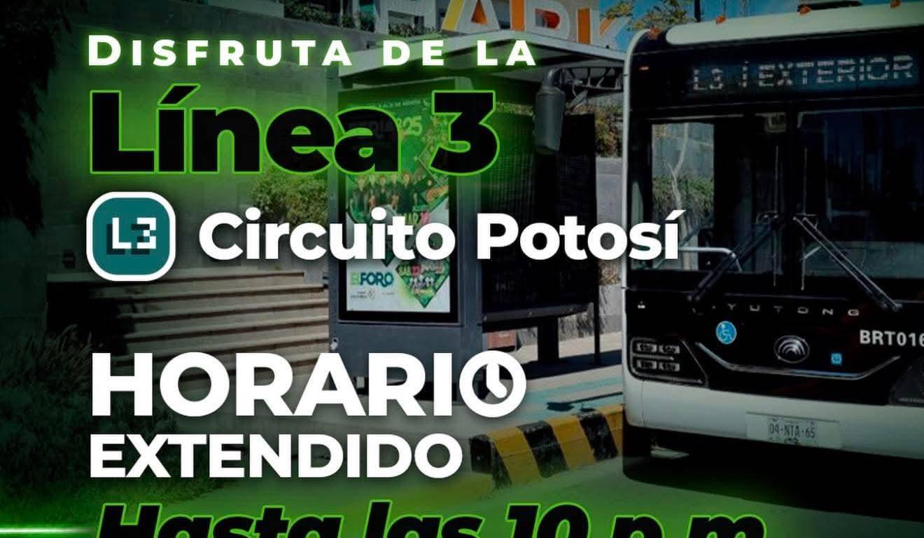 Como parte de la política que impulsa una movilidad sin límites el Gobierno del Estado de San Luis Potosí amplió el horario de operación de la Línea 3 de MetroRed – Circuito Potosí, que ahora ofrecerá servicio hasta las 22:00 horas, facilitando el traslado seguro de personas que acuden o laboran en diferentes zonas comerciales como plaza San Luis, The Park, entre otras.