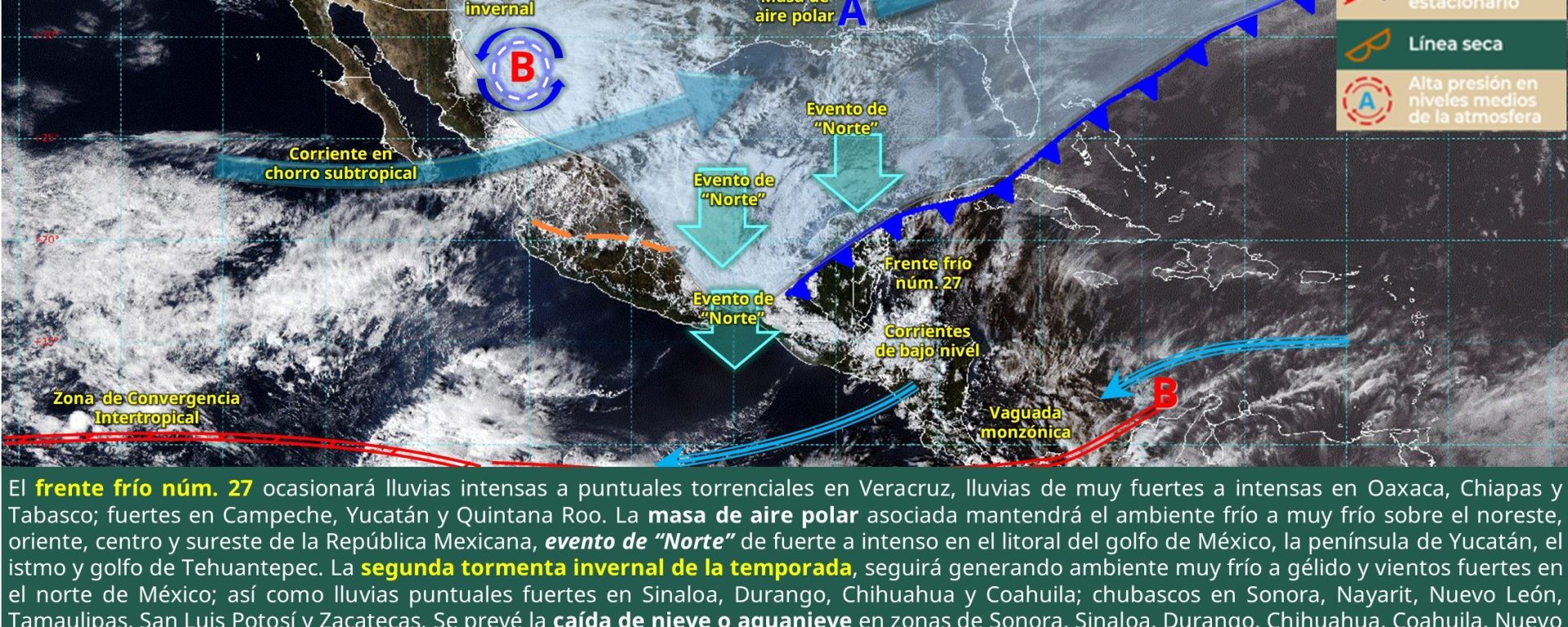 Temperaturas mínimas de -5 a 0 °C con heladas durante la madrugada del martes: zonas serranas de Baja California, Sonora, Coahuila, Nuevo León, San Luis Potosí, Aguascalientes, Jalisco, Michoacán, Guanajuato, Querétaro, Hidalgo, Estado de México, Tlaxcala, Puebla, Veracruz y Oaxaca.