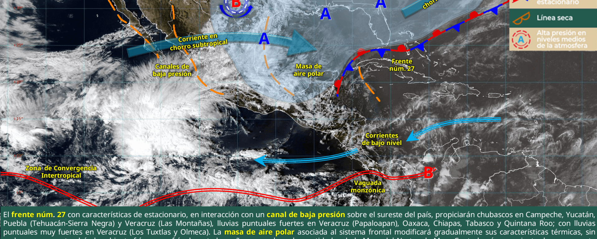 Chubascos con lluvias puntuales fuertes (25 a 50 mm): Veracruz (Los Tuxtlas y Olmeca), Oaxaca, Chiapas y Tabasco.