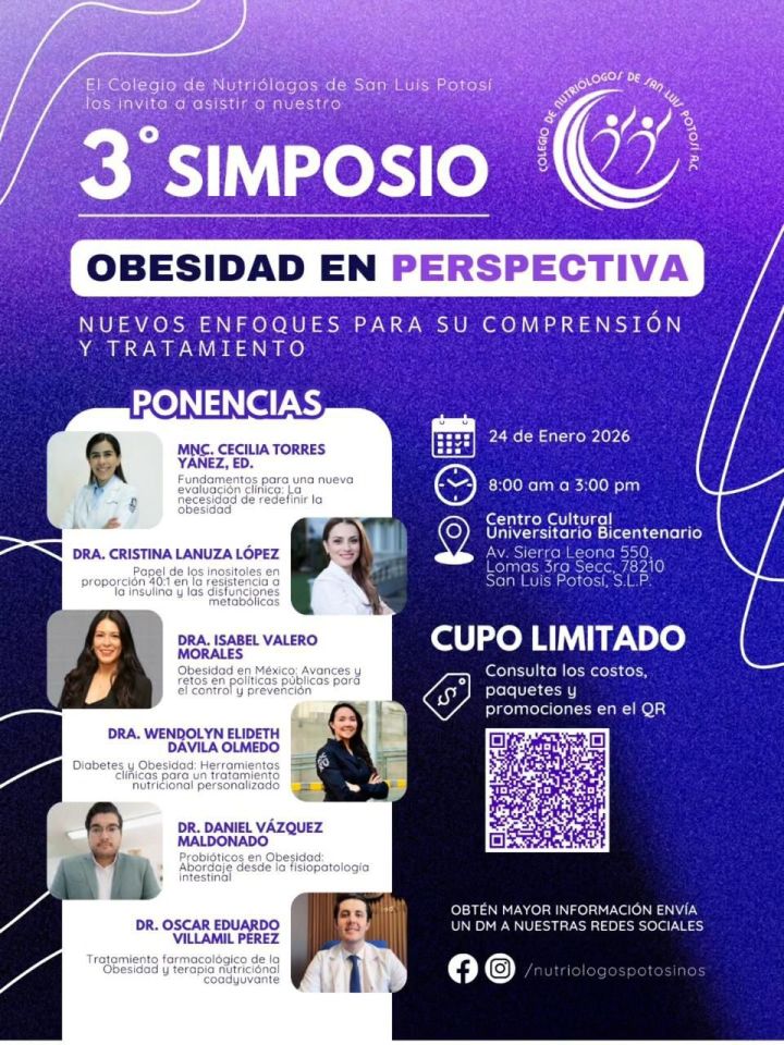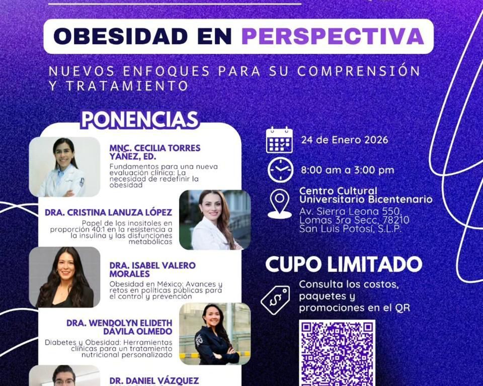 Este Congreso se desarrollará en el marco del Día del Nutriólogo y contempla una agenda integral dirigida tanto a profesionales de la nutrición como a la población en general. Como parte del programa, el viernes 24 de enero se realizará el 3° Simposio “Obesidad en Perspectiva: nuevos enfoques para su comprensión y tratamiento”, de 8:00 a 14:00 horas, en el Centro Cultural Universitario Bicentenario (CCUB), con la participación de especialistas reconocidos como el Dr. Óscar Villamil Pérez, la Dra. Isabel Valero Morales y la Dra. Wendolyn Dávila.