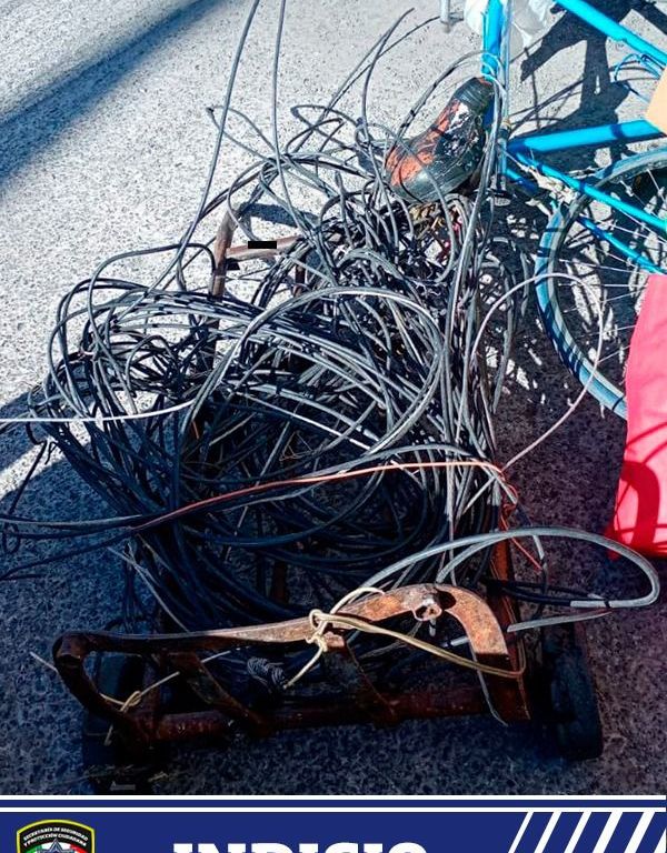 Ante la probable conducta de delito se realizó la detención de Jaime “N” de 47 años, quien tenía en las inmediaciones un diablito de metal con más metros de cable de alumbrado público, dando un total de 15 metros, además de tres bolsas con diversos metales y una bicicleta.