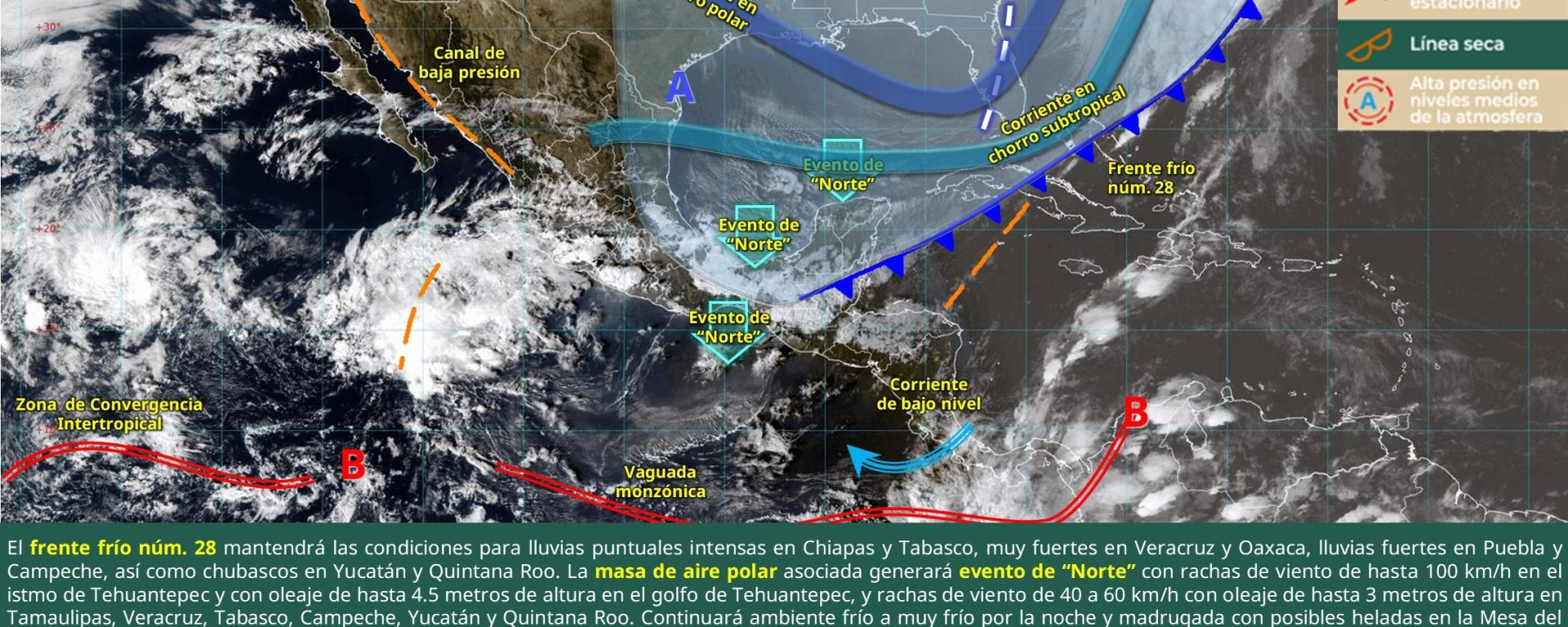 Viento de componente norte de 40 a 50 km/h con rachas de 60 a 80 km/h: istmo y golfo de Tehuantepec (Oaxaca y Chiapas).