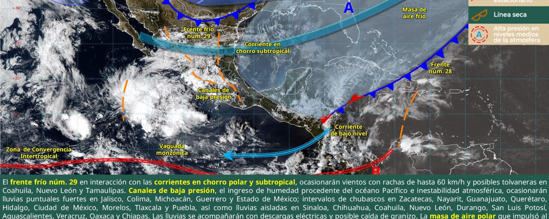 Viento de 20 a 30 km/h con rachas de 40 a 60 km/h: golfo de California, Baja California, Chihuahua, Coahuila, Nuevo León, San Luis Potosí, Puebla y Tlaxcala.