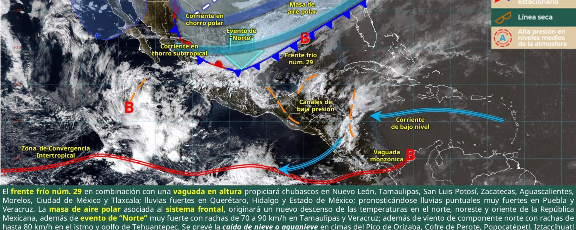 Posible caída de nieve o aguanieve: cimas del Pico de Orizaba, Cofre de Perote, Popocatépetl, Iztaccíhuatl, Nevado de Toluca y Nevado de Colima.