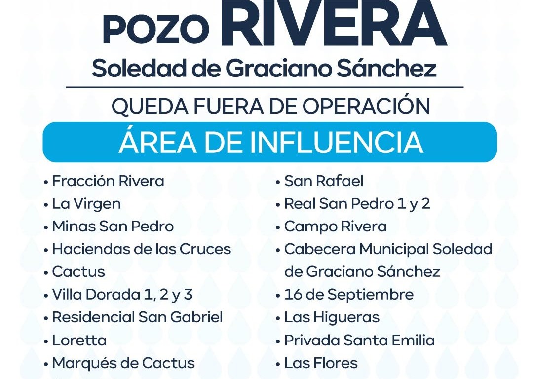 Villa Dorada 1, 2 y 3, Residencial San Gabriel, Loretta, Marques de Cactus, Santa Fe, San Rafael, Real San Pedro 1 y 2, Campo Rivera, 16 de Septiembre, Las Higueras, Privada Santa Emilia, Las Flores y la cabecera municipal Soledad de Graciano Sánchez.