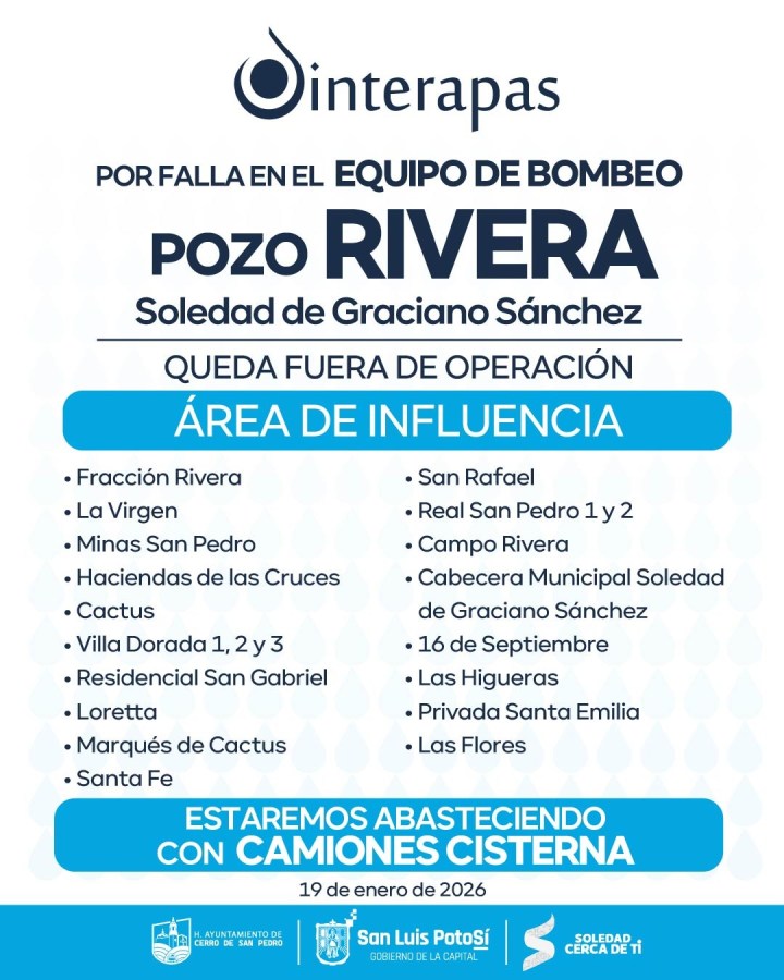 Mientras continúan los trabajos, se realizará abasto de agua potable mediante camiones cisterna en las colonias que dependen de esta fuente de suministro, entre ellas: Fracción Rivera, La Virgen, Minas San Pedro, Haciendas de las Cruces, Cactus