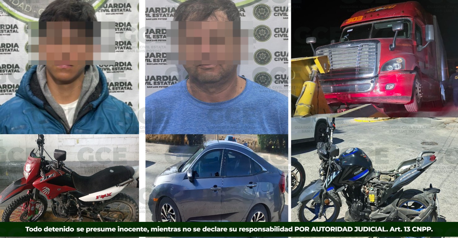 En el municipio de Villa de Arriaga, Giovanni “N” de 18 años, fue asegurado con una motocicleta marca Italika, color rojo, que tenía reporte de robo en la colonia Alpes, de la capital potosina. Por último, dos unidades fueron aseguradas, la primera en el Barrio de Tlaxcala, se trata de una motocicleta marca Italika, modelo 2025, sin placa, así como un tractocamión modelo 2016, color rojo, localizado en el municipio de Matehuala.