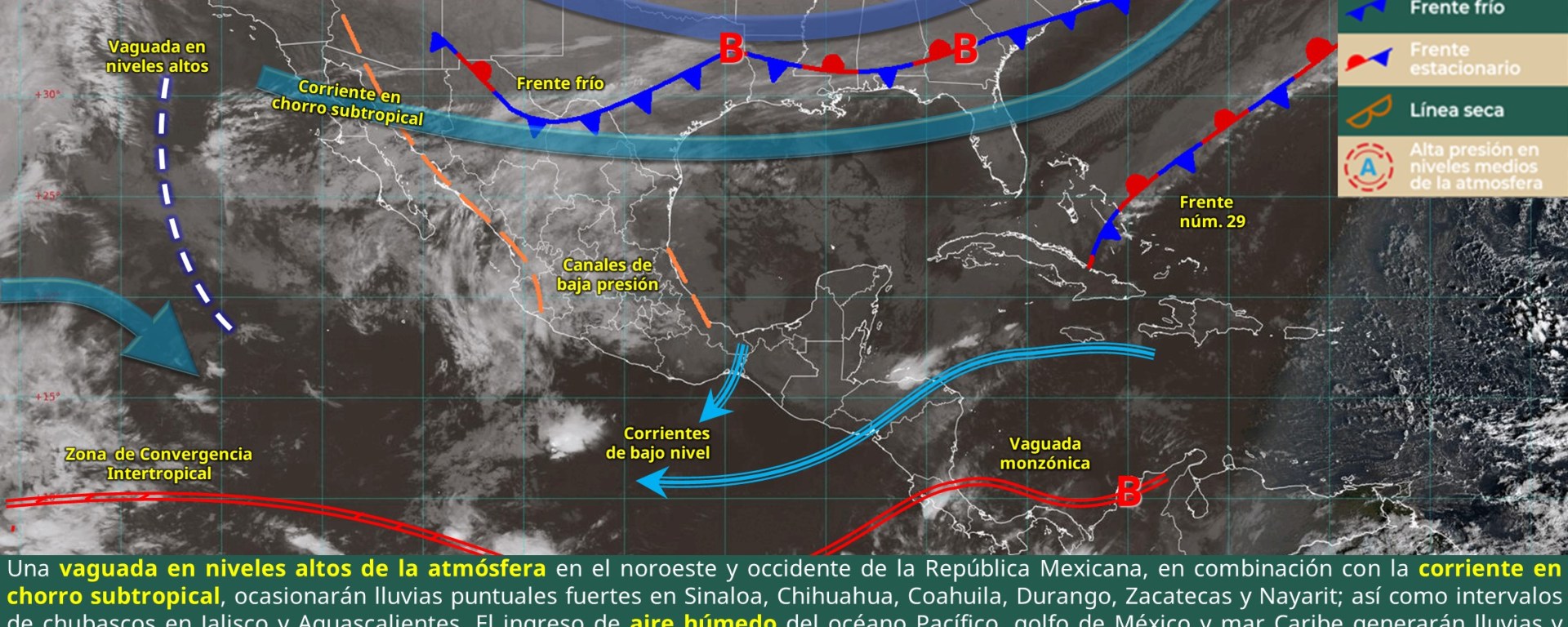 En el transcurso del día, cielo medio nublado a nublado. Por la mañana, ambiente frío en la región, siendo muy frío con heladas en sierras de Coahuila, y gélido con heladas en zonas serranas de Chihuahua y Durango. Posibilidad de lluvias aisladas matutinas en zonas de Coahuila, Nuevo León, Durango, Zacatecas y Aguascalientes. Durante la tarde, ambiente fresco a templado; probabilidad de lluvias puntuales fuertes en Zacatecas, Durango, Chihuahua y Coahuila; las cuales podrían originar incremento en los niveles de ríos y arroyos, deslaves, encharcamientos e inundaciones; asimismo, se pronostican intervalos de chubascos en Nuevo León, Aguascalientes y San Luis Potosí. Viento de 10 a 20 km/h con rachas de 30 a 50 km/h en Chihuahua, Coahuila, Nuevo León, Durango, Zacatecas y San Luis Potosí.