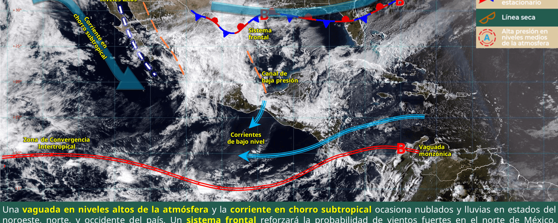 Viento de 10 a 20 km/h con rachas de 30 a 50 km/h: Nuevo León, Durango, Zacatecas, Aguascalientes, San Luis Potosí, Guanajuato, Querétaro, Hidalgo, Estado de México, Ciudad de México y Puebla.