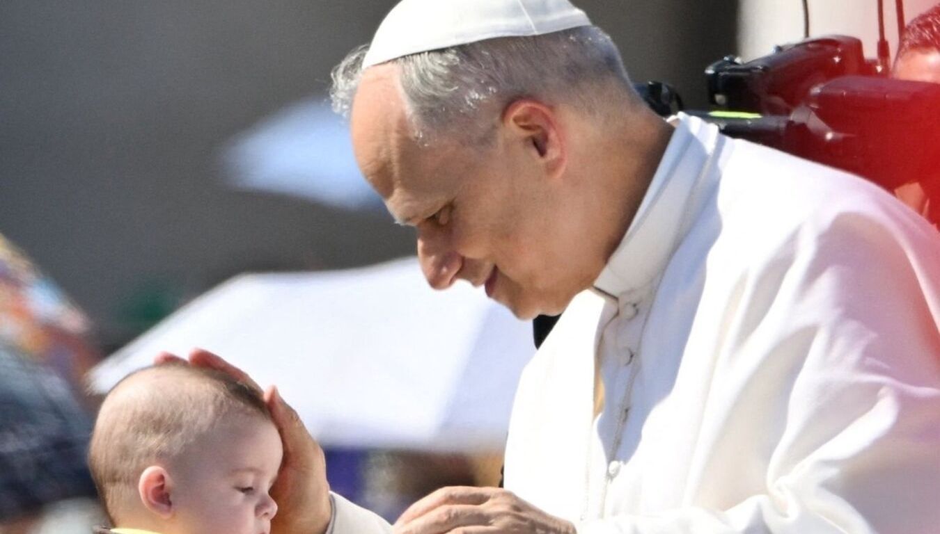 El Papa León XIV bendice un bebé en el Vaticano. | Crédito: Daniel Ibáñez / EWTN News