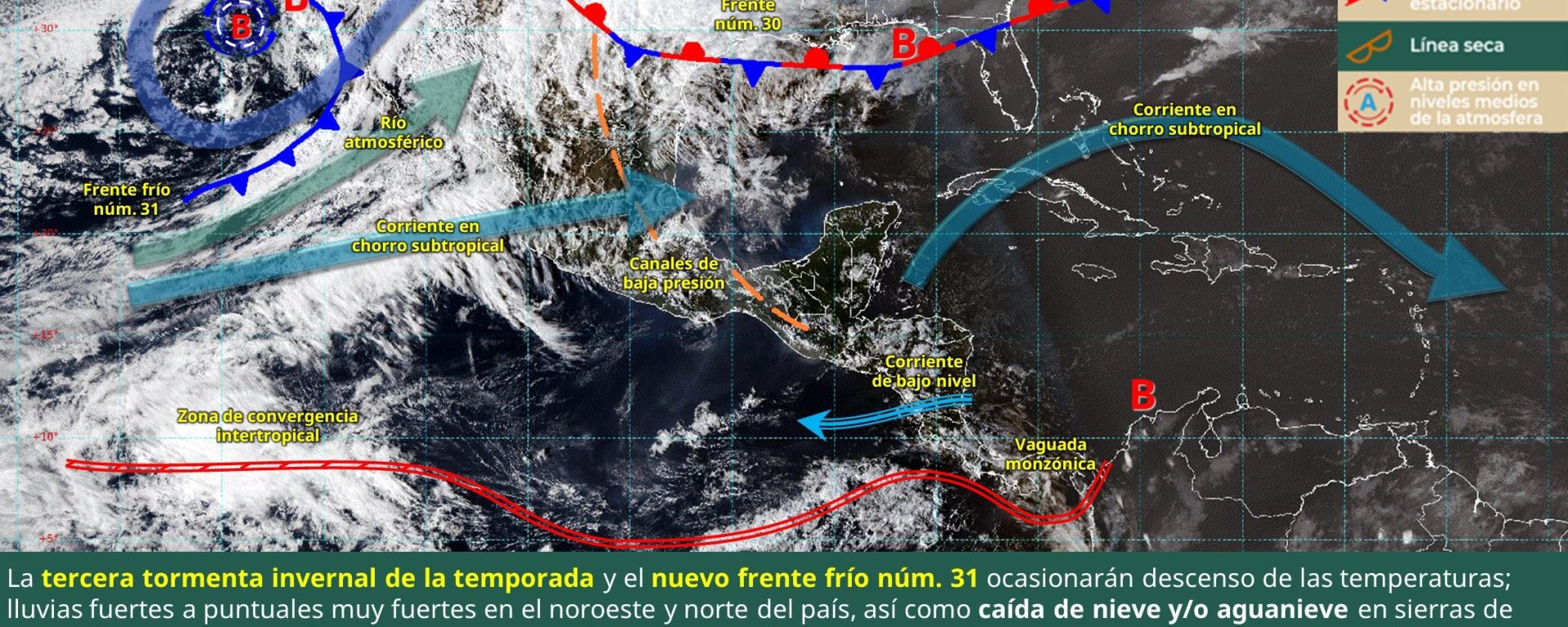 Posible caída de nieve y/o aguanieve: sierras de Baja California, Sonora, Chihuahua, Sinaloa, Durango y Coahuila.