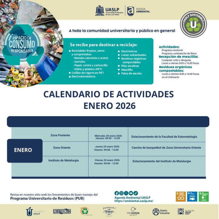 La Agenda Ambiental de la Universidad Autónoma de San Luis Potosí (UASLP) llevará a cabo el primer Programa de Consumo Responsable del año 2026 el próximo miércoles 28 de enero, en el estacionamiento de la Facultad de Estomatología, en la Zona Universitaria Poniente, dio a conocer Georgina Alejandra Calvillo Castellanos, coordinadora del Sistema de Gestión Ambiental.