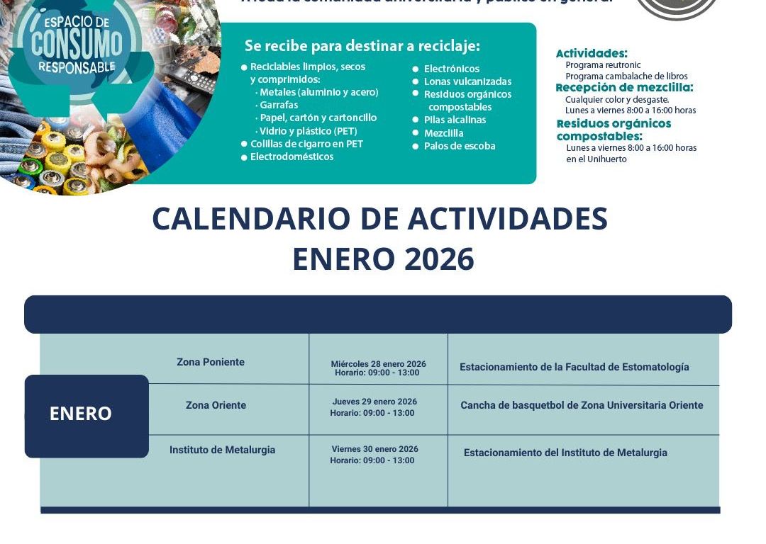 La Agenda Ambiental de la Universidad Autónoma de San Luis Potosí (UASLP) llevará a cabo el primer Programa de Consumo Responsable del año 2026 el próximo miércoles 28 de enero, en el estacionamiento de la Facultad de Estomatología, en la Zona Universitaria Poniente, dio a conocer Georgina Alejandra Calvillo Castellanos, coordinadora del Sistema de Gestión Ambiental.
