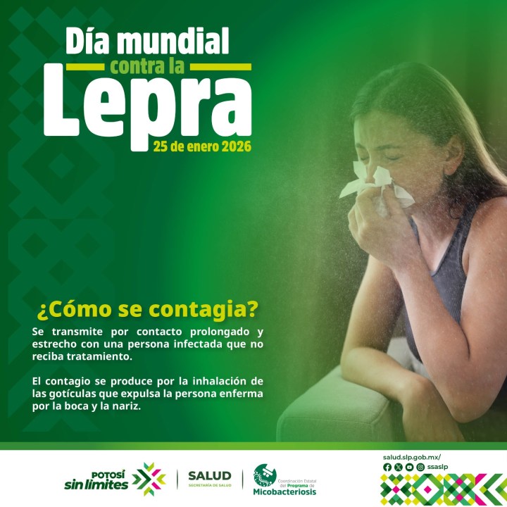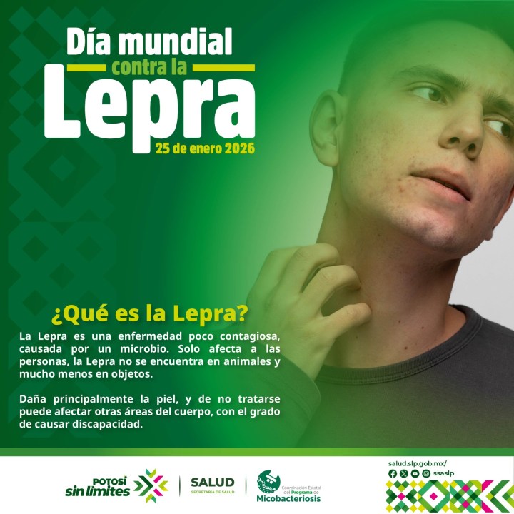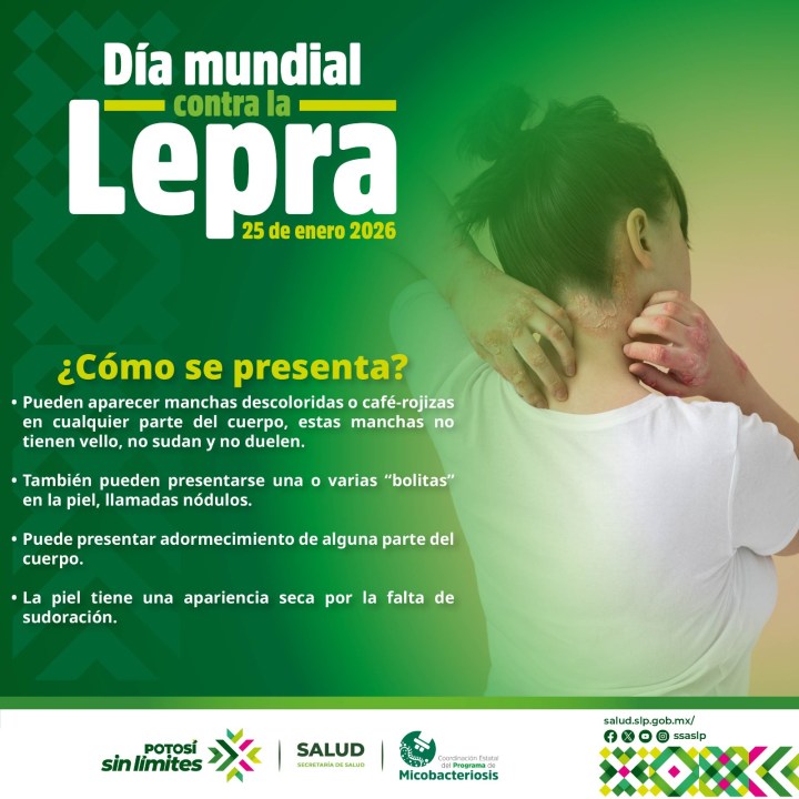 Como cada año, el último domingo del mes de enero se conmemora el Día Mundial contra la Lepra, este 2026, bajo el lema: «¡Alcemos la voz, la lepra existe! Acabemos con ella… sin estigma ni discriminación», preocupados por el bienestar de la población del estado, con énfasis en los grupos vulnerables, y mediante la coordinación con diversas instituciones, se generan estrategias como: Ferias de salud para la detección oportuna de casos sospechosos de lepra; jornadas dermatológicas en el estado para la captación y atención de usuarios en dos áreas sociodemográficas durante el año 2026, realizadas por tres institutos.
