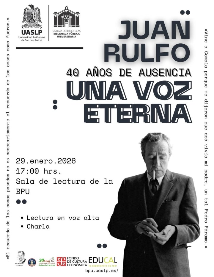La jornada contempla una lectura en voz alta y una charla en torno a la obra y trascendencia de Rulfo, con el objetivo de fomentar el gusto por la lectura y fortalecer el vínculo entre la literatura y la comunidad. La actividad será de entrada libre y abierta a todo público, como parte del compromiso institucional de la UASLP con la difusión cultural y la promoción del patrimonio literario.