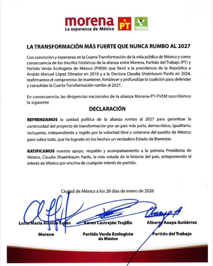 Los partidos Verde Ecologista de México (PVEM), Morena y del Trabajo (PT) emitieron una declaración conjunta en la que reiteraron su decisión de mantenerse unidos rumbo a las elecciones de las gubernaturas en el 2027 y el respaldo a la presidenta Claudia Sheinbaum Pardo y subrayaron la importancia de continuar sumando fuerzas del movimiento de la Cuarta Transformación en defensa de la soberanía.