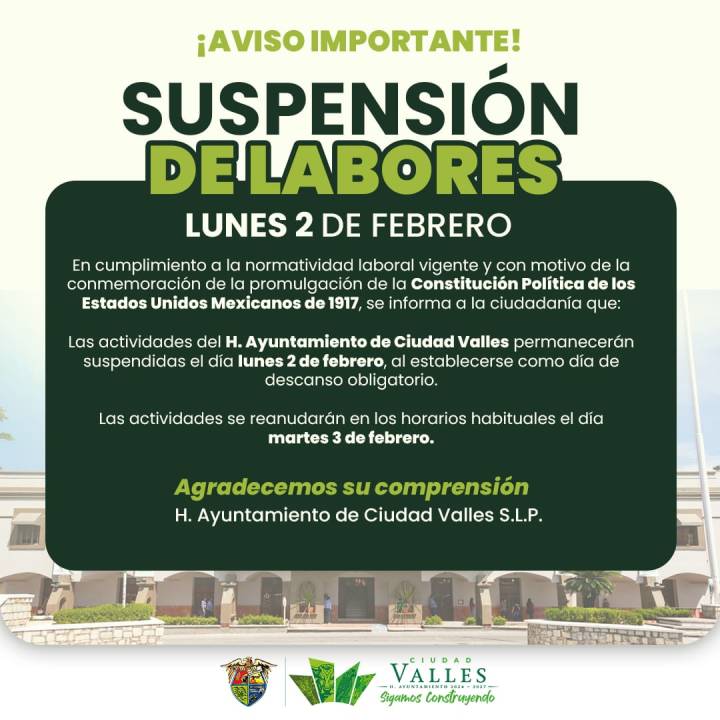 CIUDAD VALLES, S.L.P. – El H. Ayuntamiento de Ciudad Valles informa a la población que, con motivo de la conmemoración de la promulgación de la Constitución Política de los Estados Unidos Mexicanos de 1917, se suspenderán labores en la mayoría de las áreas municipales este lunes 02 de febrero.