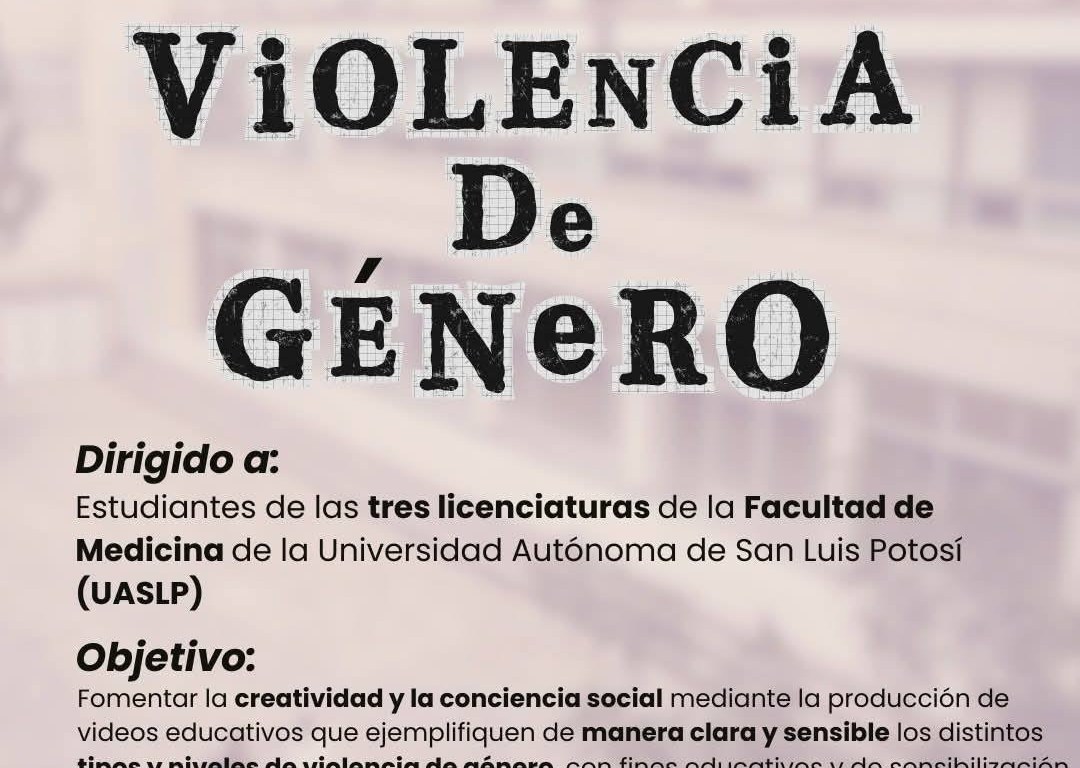 La Facultad de Medicina de la Universidad Autónoma de San Luis Potosí (UASLP) lanzó el concurso de video educativo “Visualizando los niveles de la violencia de género”, una iniciativa dirigida a su comunidad estudiantil que busca fortalecer la prevención, la información y la conciencia sobre este problema dentro y fuera de los espacios universitarios.