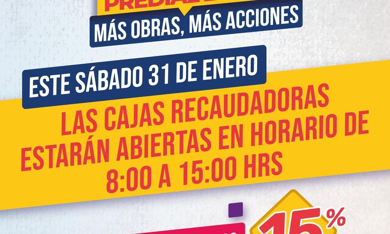 Este sábado 31 de enero, las cajas recaudadoras municipales atenderán en horario especial de 8:00 a 15:00 horas, con el objetivo de facilitar a la ciudadanía el pago del Predial 2026 y el acceso al descuento vigente del 15 por ciento.