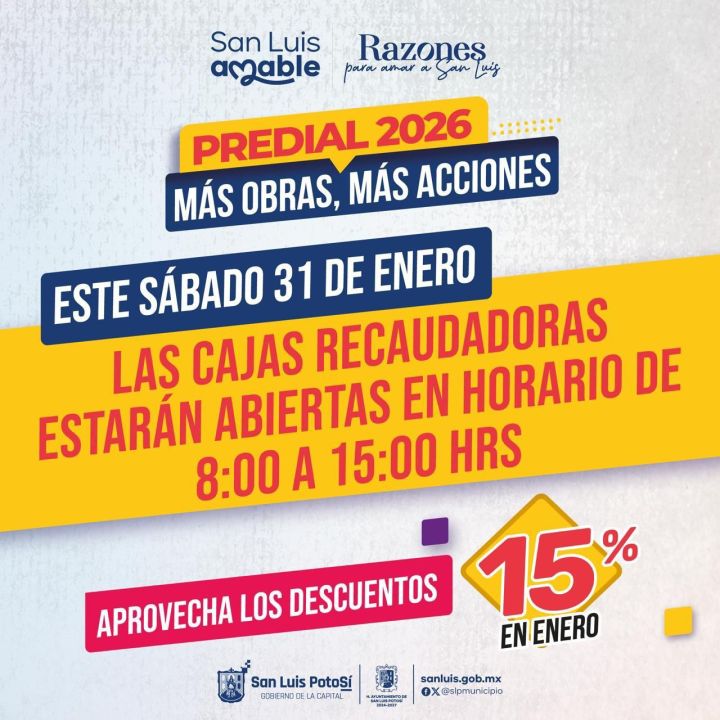 El Gobierno de la Capital informa a la población que, como parte de las acciones para incentivar el cumplimiento del pago del Predial 2026, este sábado 31 de enero las cajas recaudadoras municipales permanecerán abiertas en horario especial de 8:00 a 15:00 horas, permitiendo a las y los contribuyentes realizar su trámite de manera ágil y accesible.