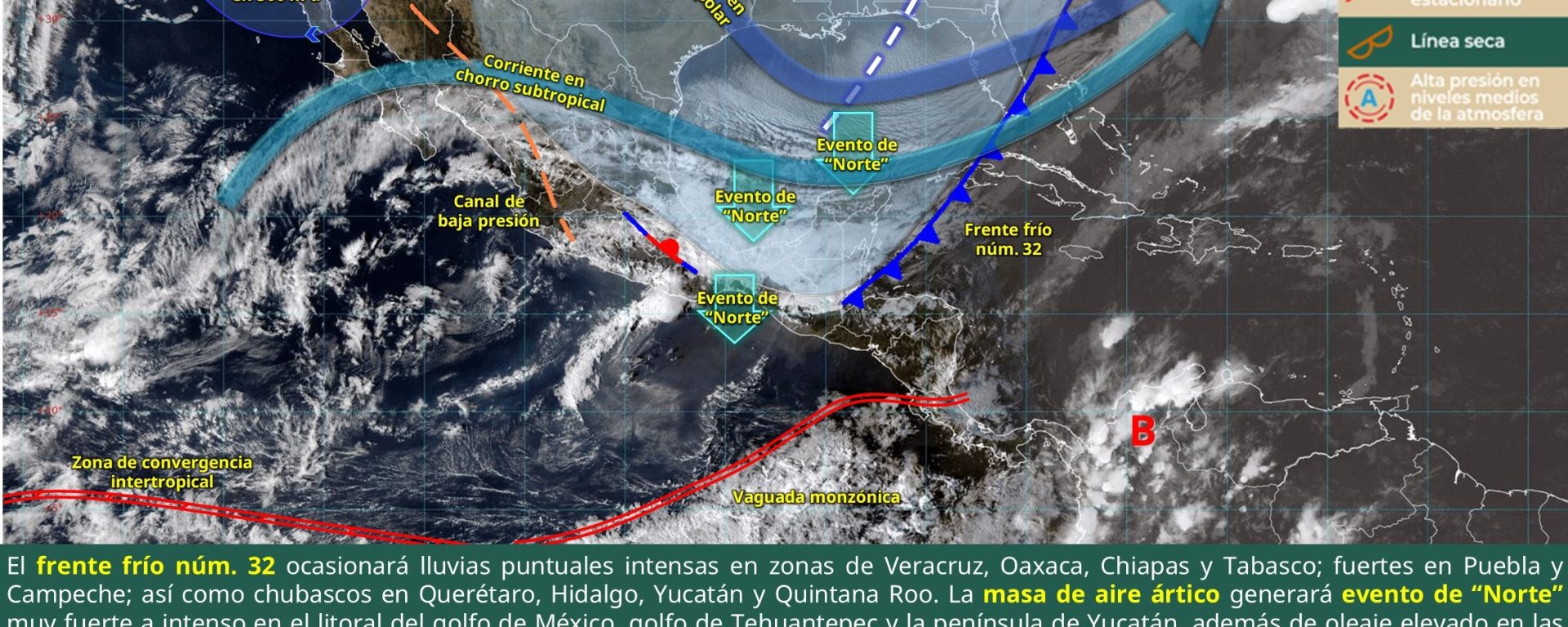 Viento de componente norte de 60 a 70 km/h con rachas de 80 a 100 km/h: istmo y golfo de Tehuantepec (Oaxaca y Chiapas); y de 20 a 30 km/h con rachas de 40 a 60 km/h: Veracruz y Tabasco.