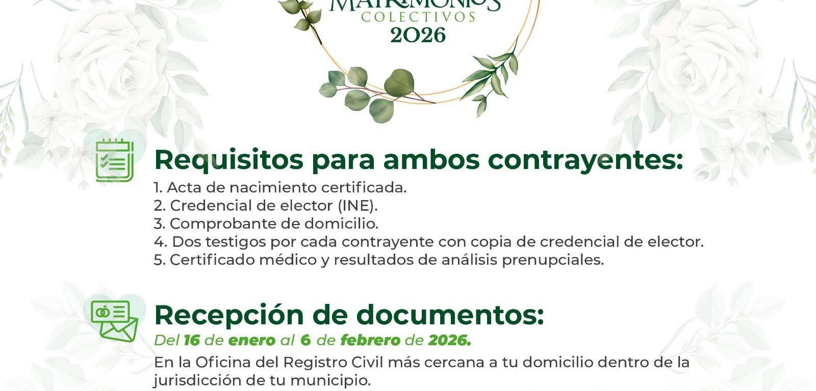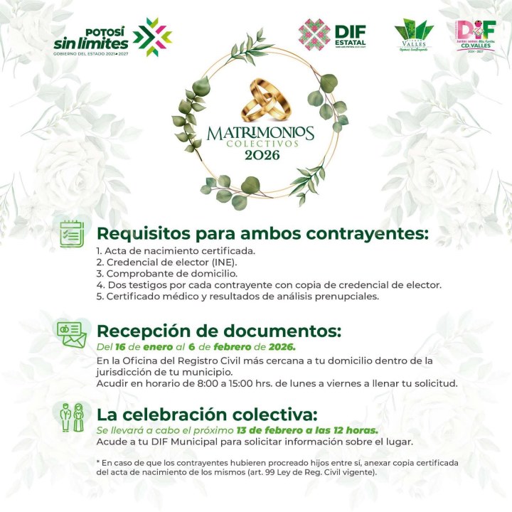 La documentación puede ser entregada en cualquiera de las Oficialías del Registro Civil 01, 02, 03 y 04, con sede en Ciudad Valles, la Delegación de Rascón o el Pujal, así como de manera directa en las instalaciones del Sistema Municipal DIF, en un horario de 08:00 de la mañana a 03:00 de la tarde. La celebración de los matrimonios colectivos se llevará a cabo el próximo 13 de febrero, en punto de las 12:00 horas, brindando certeza jurídica a la unión de dos personas.