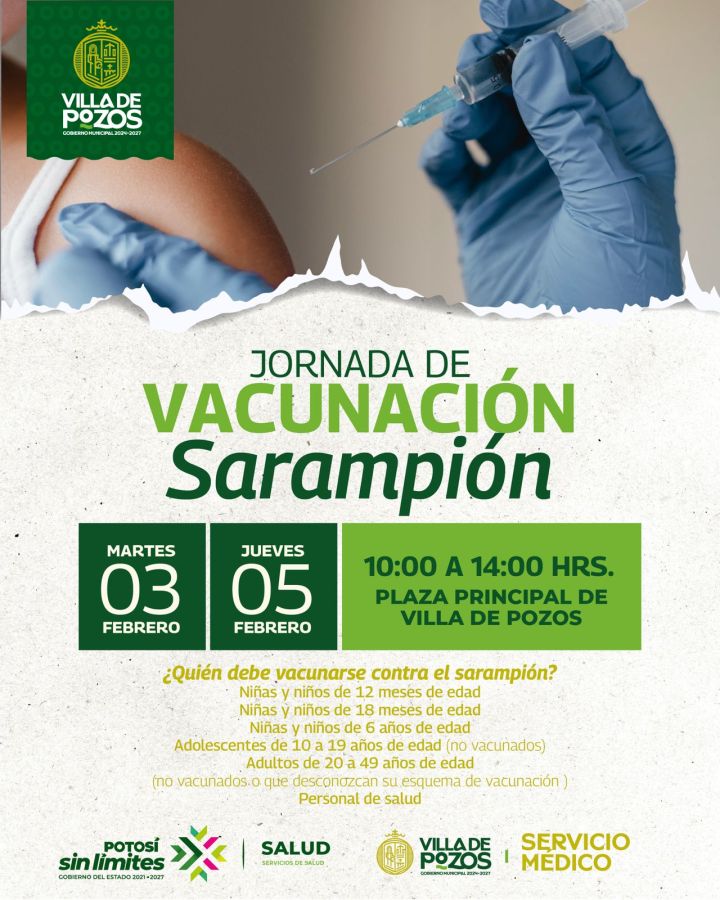 Con el objetivo de reforzar las acciones de prevención y protección a la salud de las y los ciudadanos, el Gobierno Municipal de Villa de Pozos en coordinación con los Servicios de Salud del Estado, llevará a cabo una Jornada de Vacunación contra el Sarampión, dirigida a distintos grupos de edad.