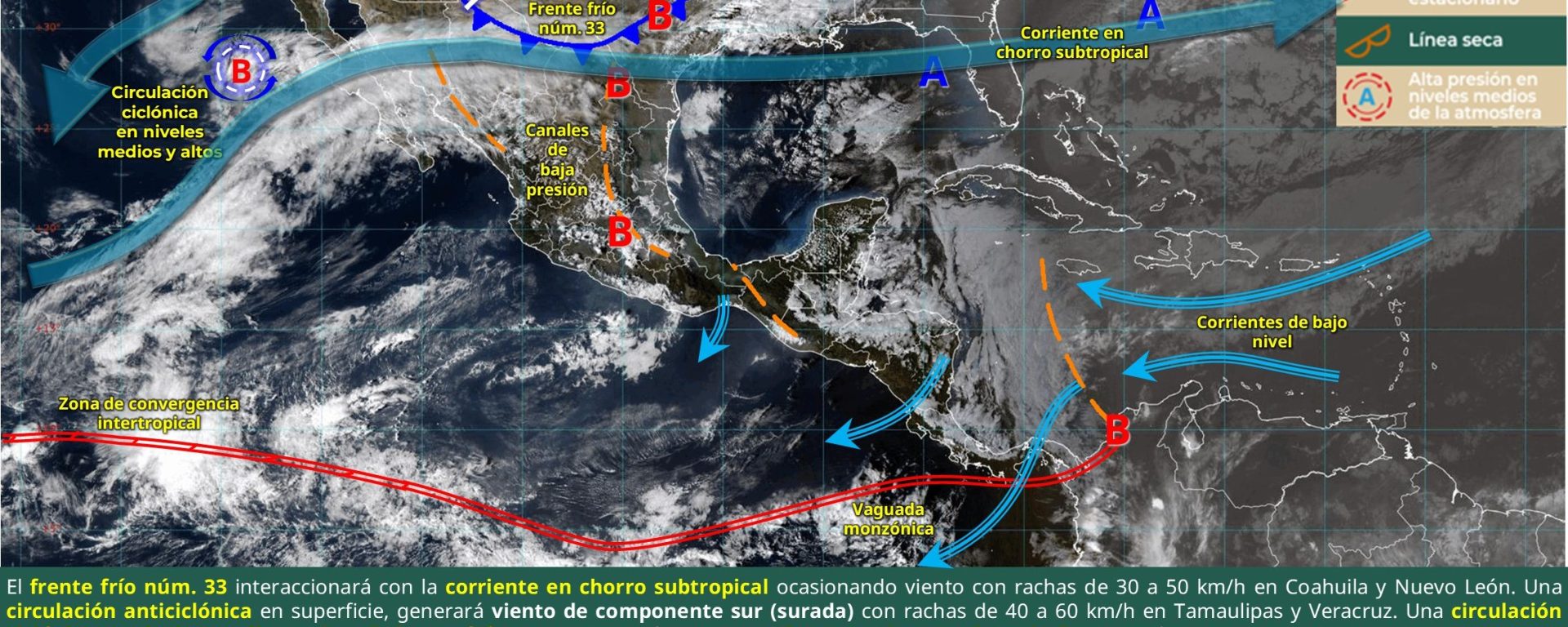 Evento de “Norte” de 40 a 50 km/h con rachas de 60 a 80 km/h: Tamaulipas y Veracruz; extendiéndose durante la noche: istmo y golfo de Tehuantepec (Oaxaca y Chiapas).