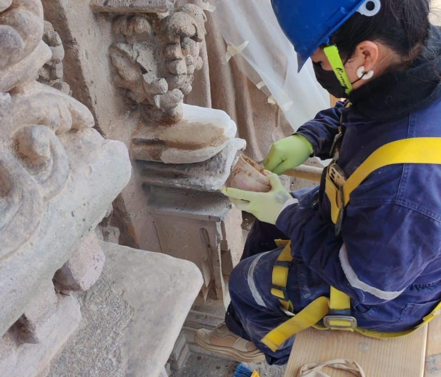 Actualmente, los trabajos consisten en labores especializadas de limpieza y restauración, enfocadas en retirar residuos, manchas y afectaciones provocadas por el paso del tiempo, así como en reparar elementos dañados de la fachada, con el fin de mantenerla en condiciones seguras y preservar su valor histórico y estético para las futuras generaciones.