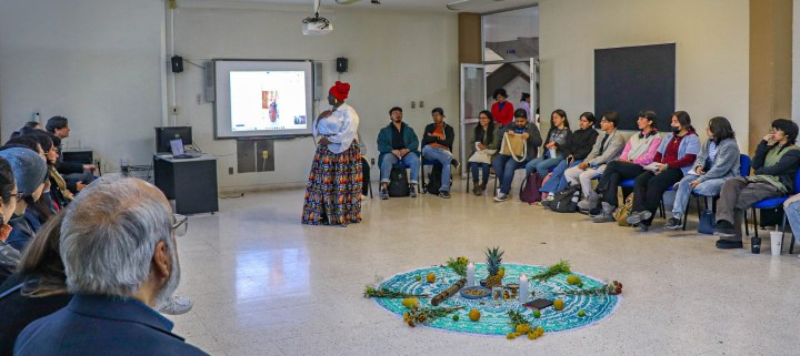 Señaló que su estancia en la UASLP tiene como propósito compartir un mensaje de sanación y paz con mujeres que han sido desplazadas de sus territorios de origen, experiencia que también ha marcado su propia historia de vida. Explicó que el territorio no debe entenderse únicamente como un espacio físico, sino como un entramado de saberes ancestrales, memoria e identidad.