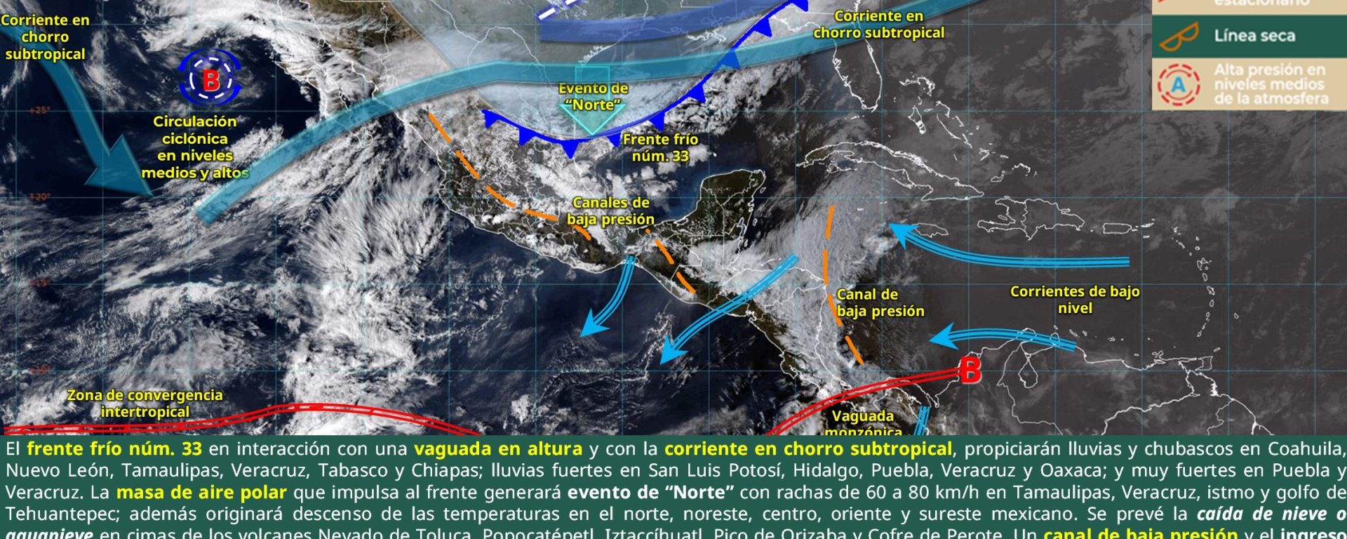 Evento de “Norte” de 60 a 80 km/h con rachas de 90 a 110 km/h: istmo y golfo de Tehuantepec (Oaxaca y Chiapas); de 50 a 60 km/h con rachas de 70 a 90 km/h: Veracruz; de 30 a 40 km/h con rachas de 50 a 70 km/h: Tabasco, Campeche, Yucatán y Quintana Roo, así como de 20 a 30 km/h con rachas de 40 a 60 km/h, durante la mañana: Tamaulipas.