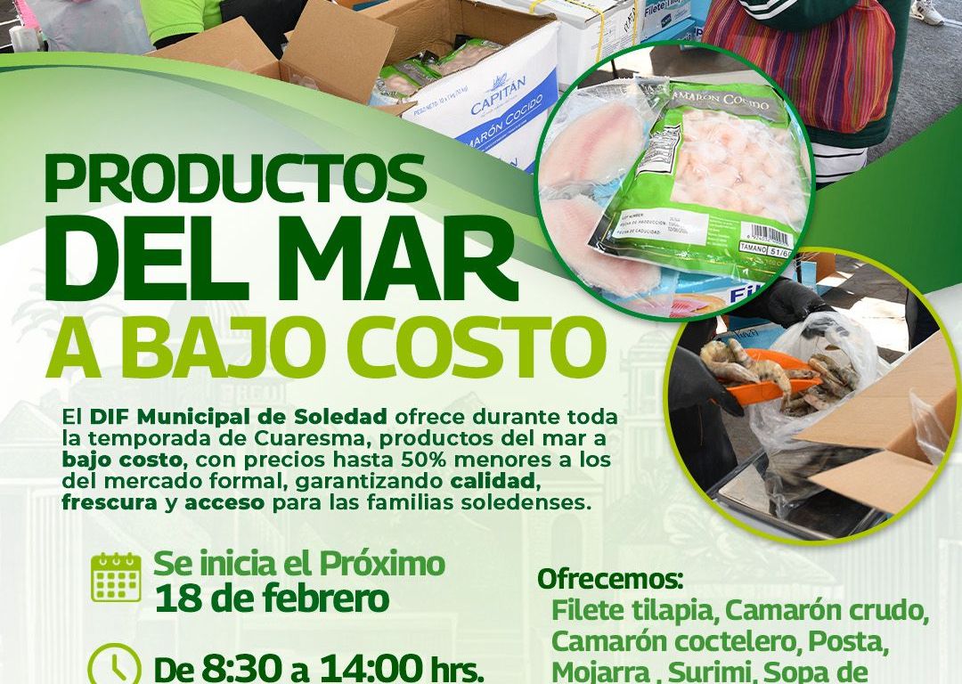 A fin de apoyar la economía familiar y mantenerse cerca de la población durante la temporada de Cuaresma, el Ayuntamiento de Soledad de Graciano Sánchez, a través del Sistema Municipal para el Desarrollo Integral de la Familia (DIF), iniciará el próximo miércoles de ceniza, 18 de febrero, el programa de venta de pescado y productos del mar a bajo costo, con precios hasta 50 por ciento menores a los del mercado regular, garantizando calidad, frescura y acceso para las familias.