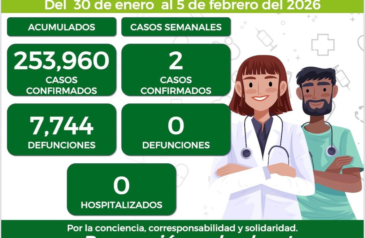 Del 30 de enero al 5 de febrero del presente año, se registraron 2 nuevos contagios de COVID-19 confirmando el Comité Estatal para la Seguridad en Salud y los Servicios de Salud 253 mil 960 casos totales de esta enfermedad.