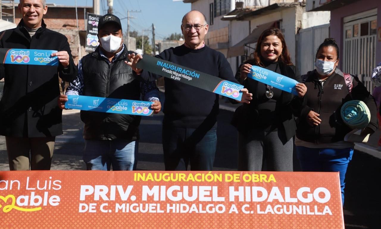 Al hacer entrega de la obra vial de la calle Privada Miguel Hidalgo, en la Delegación La Pila, el Presidente Municipal de San Luis Capital, Enrique Galindo Ceballos, señaló que esta vialidad de 2 mil 140 metros cuadrados, muestra el gran avance en el desarrollo de esta demarcación, ya que se trata de la décimo primera pavimentación realizada en La Pila durante la actual administración.