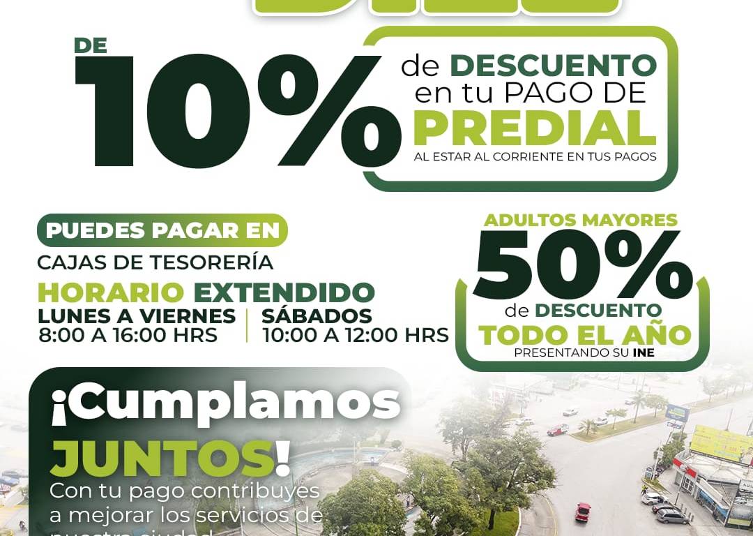 CIUDAD VALLES, S.L.P.- La Tesorería Municipal hace un llamado a las y los contribuyentes para que continúen aprovechando el descuento en el pago de impuesto predial correspondiente al ejercicio 2026, pues durante el mes de febrero se estará aplicando el 10 por ciento. De igual manera, se invita a las y los ciudadanos para que se acerquen a regularizar adeudos y se mantengan al corriente con sus pagos.