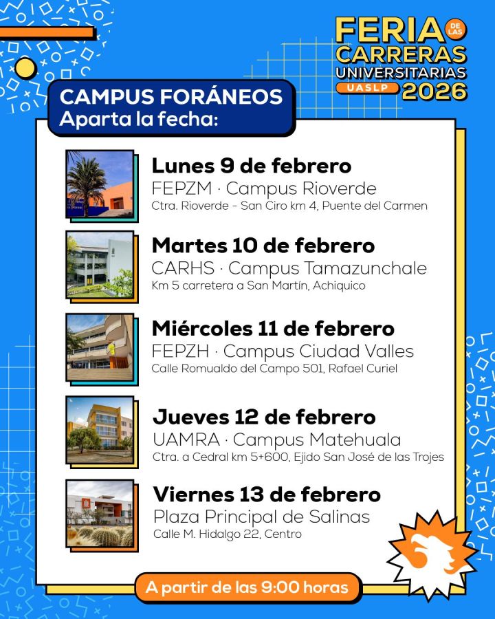 En el Altiplano, el evento se realizará el jueves 12 de febrero en la Unidad Académica Multidisciplinaria Región Altiplano (UAMRA), en Matehuala, y concluirá su recorrido regional el viernes 13 de febrero en la Coordinación Académica Región Altiplano Oeste (CARAO), en la plaza principal del municipio de Salinas. Finalmente, la Feria de las Carreras 2026 tendrá su sede central los días jueves 20 y viernes 21 de febrero en el Patio del Edificio Central de la UASLP, en la ciudad de San Luis Potosí.