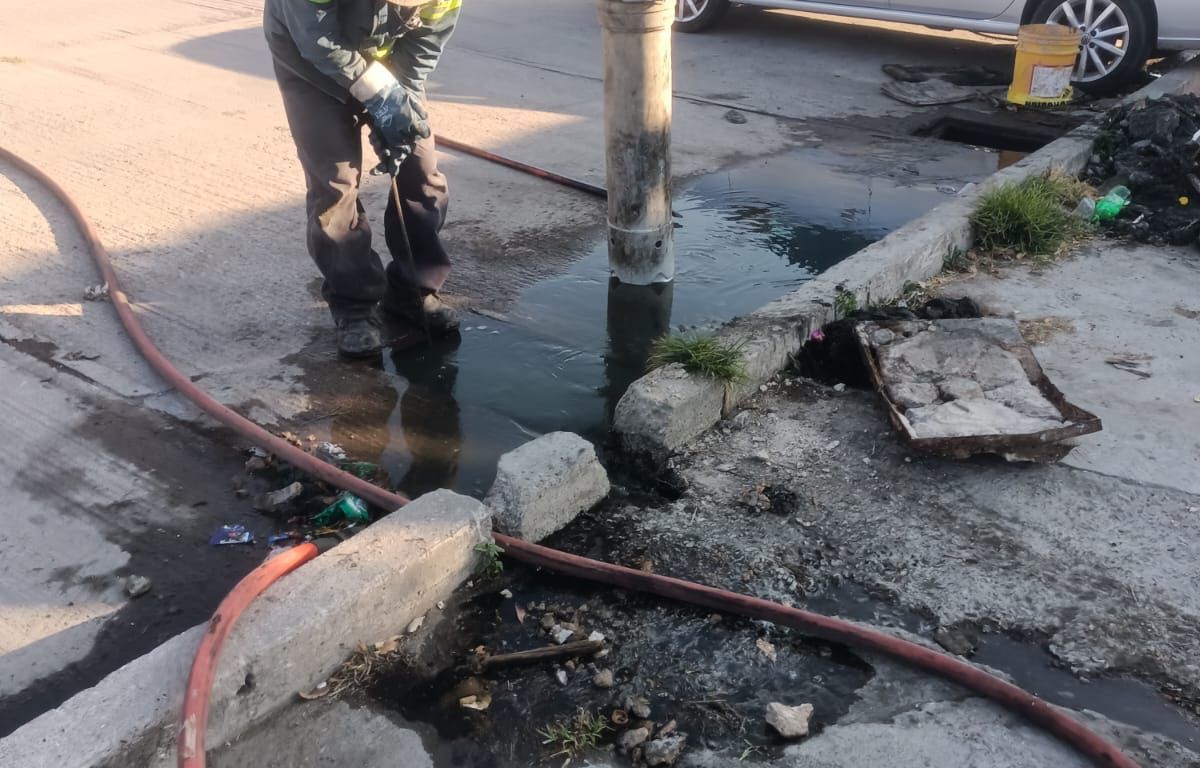Con apoyo de camión hidroneumático se efectuaron sondeos y limpieza en la red pública municipal para liberar posibles obstrucciones y bajar los niveles en la línea sanitaria. Sin embargo, durante la inspección se detectó que el problema no se originaba en la tubería de drenaje, sino en la descarga sanitaria del propio mercado, la cual se encuentra saturada y corresponde a infraestructura bajo jurisdicción estatal.