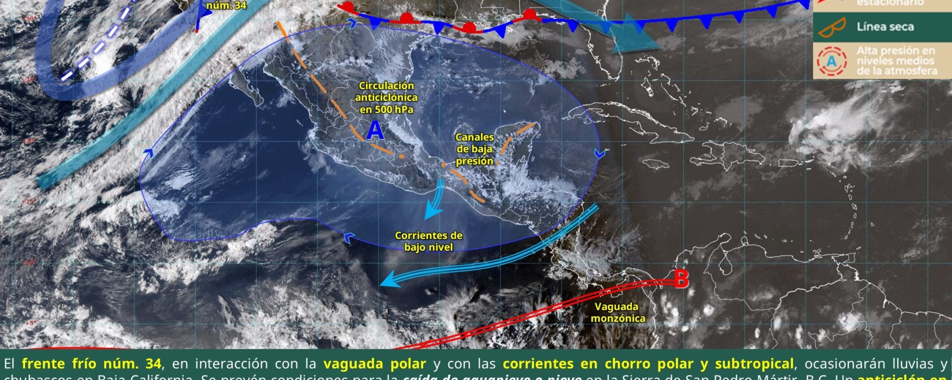 Posible caída de nieve o aguanieve: sierras de Baja California, Sonora y Chihuahua.