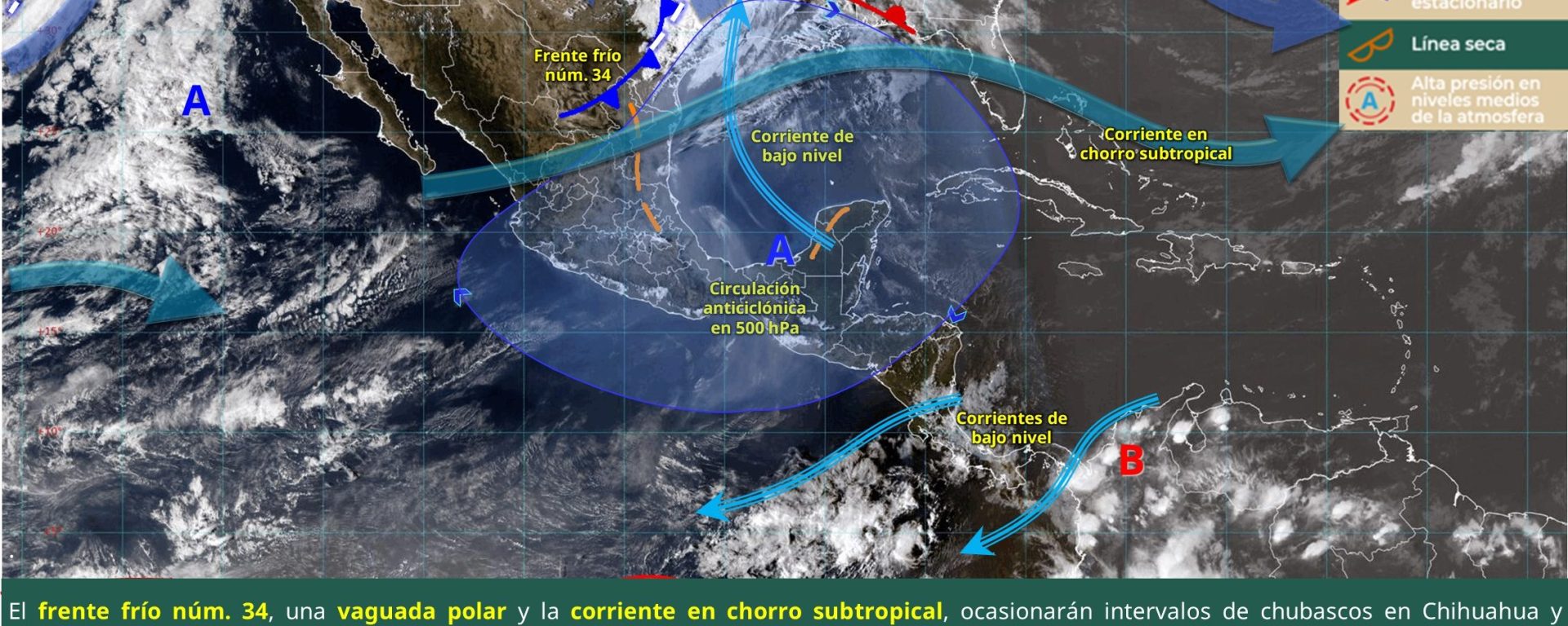 Viento de 20 a 30 km/h con rachas de 40 a 60 km/h: Baja California, Chihuahua, Coahuila, Nuevo León y Tamaulipas.