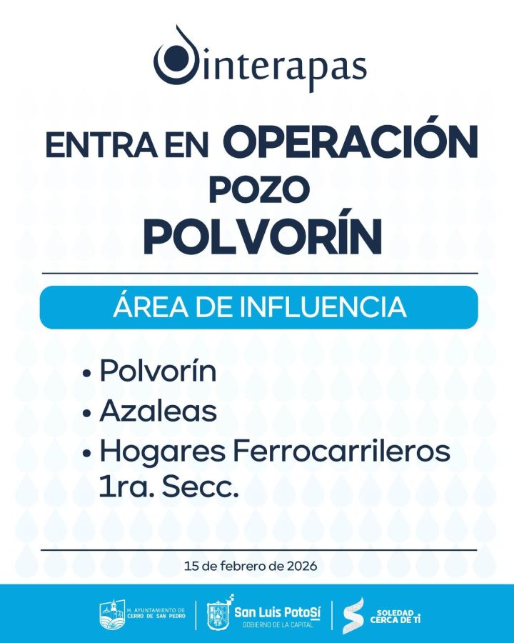 SLP.- Este domingo quedó nuevamente en funcionamiento el pozo Polvorín, ubicado en el municipio de Soledad de Graciano Sánchez, tras concluir los trabajos técnicos necesarios para su reactivación.