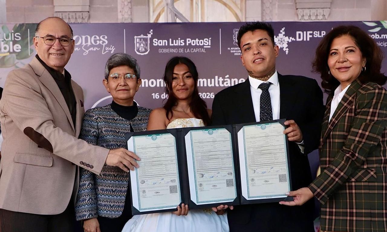 En la Plaza de Armas, el Alcalde Enrique Galindo Ceballos y la Presidenta del DIF Municipal, Estela Arriaga Márquez, fungieron como testigos de honor en el matrimonio civil de 217 nuevas parejas, en una ceremonia para fortalecer a las familias de San Luis Capital.