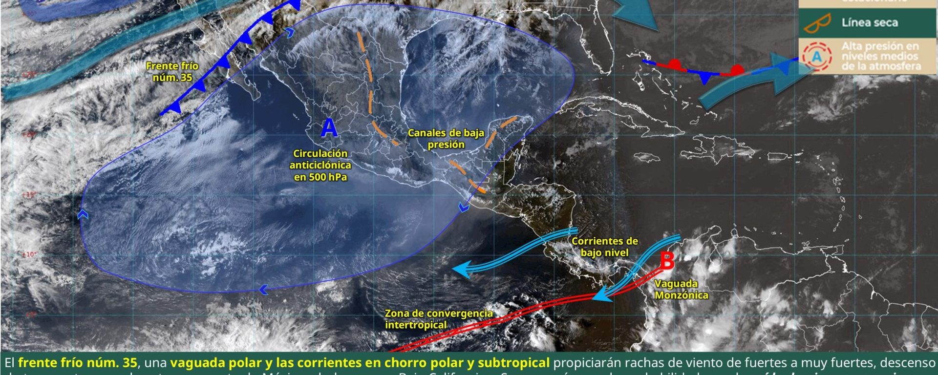 Viento de 50 a 60 km/h con rachas de 70 a 90 km/h: golfo de California, Baja California, Sonora, Chihuahua y Durango.