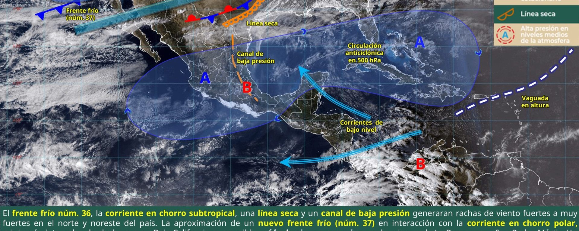 Viento de 40 a 50 km/h con rachas de 60 a 80 km/h: Sonora, Chihuahua y Durango; y de componente sur: istmo de Tehuantepec (Oaxaca y Chiapas) y Veracruz (sur).