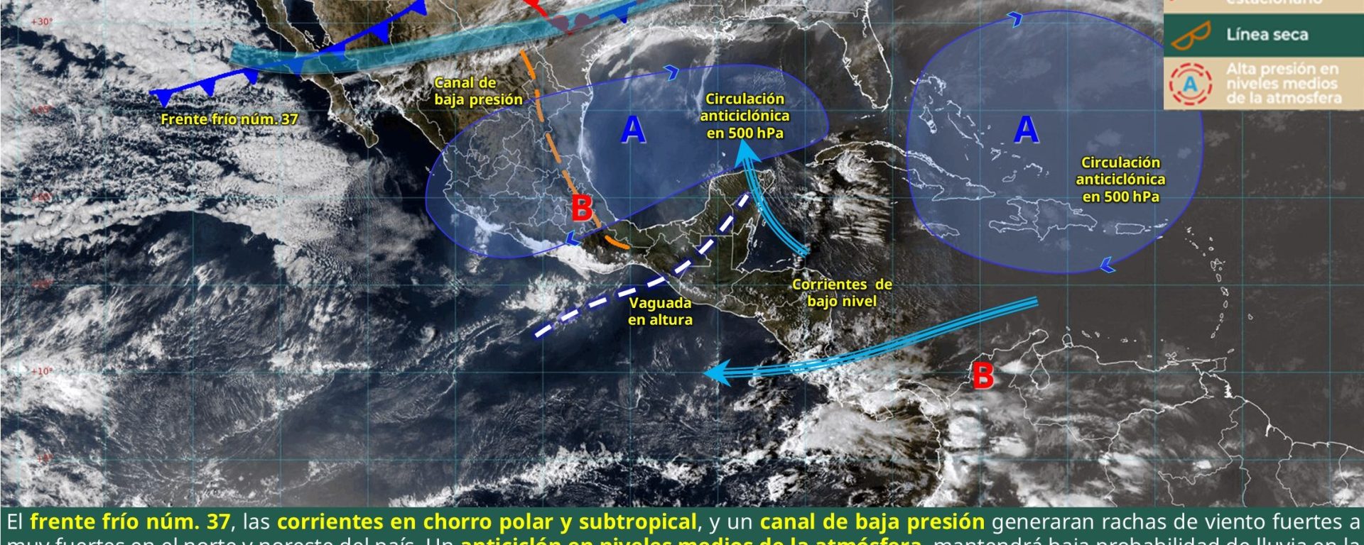 Viento de 30 a 40 km/h con rachas de 50 a 70 km/h en el golfo de California, con posibles tolvaneras: Baja California, Baja California Sur, Durango, Coahuila, Nuevo León, Tamaulipas y San Luis Potosí.