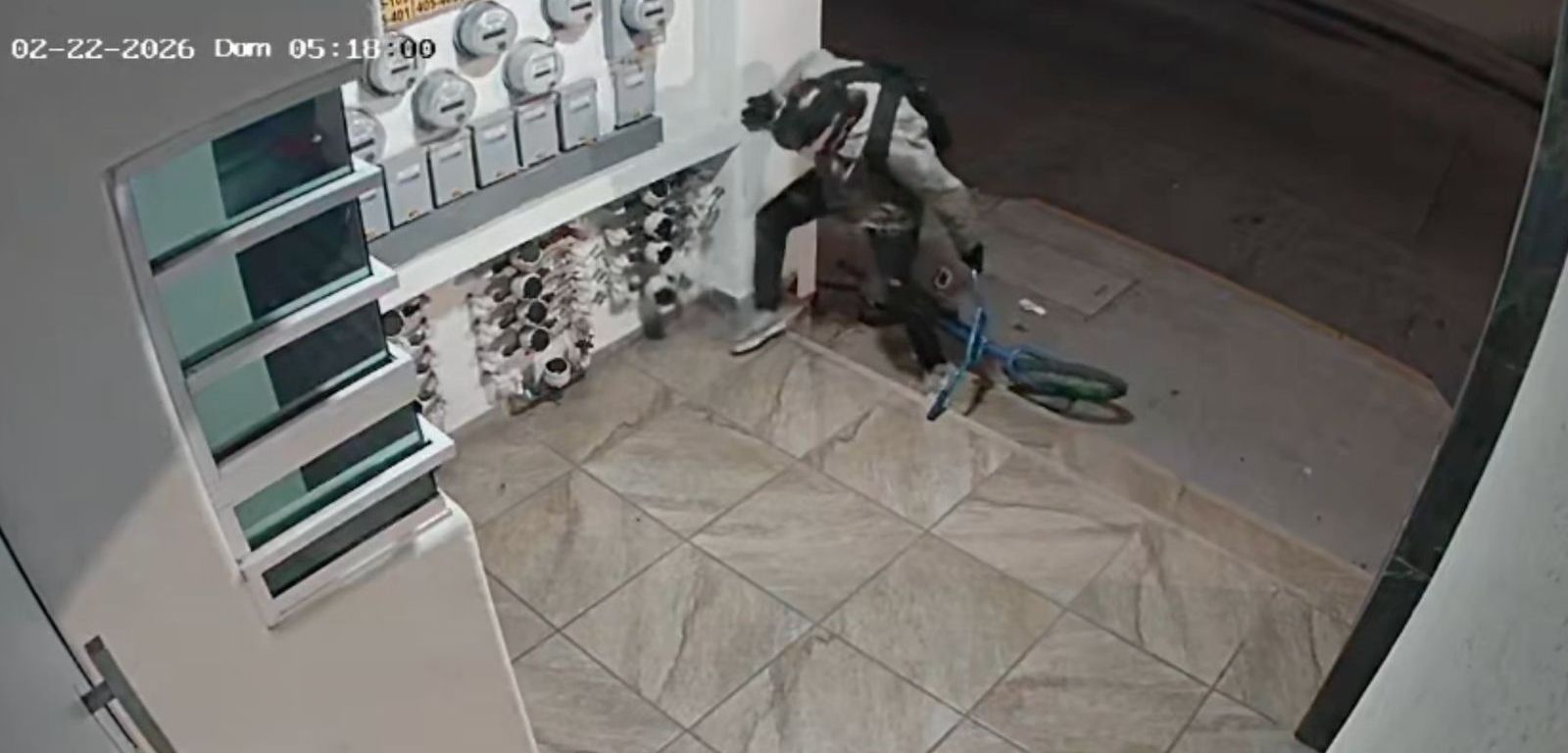 Videos de cámaras de vigilancia en edificios de la zona muestran a un hombre que, a bordo de una bicicleta, patea los medidores y posteriormente se lleva la estructura de plástico.
