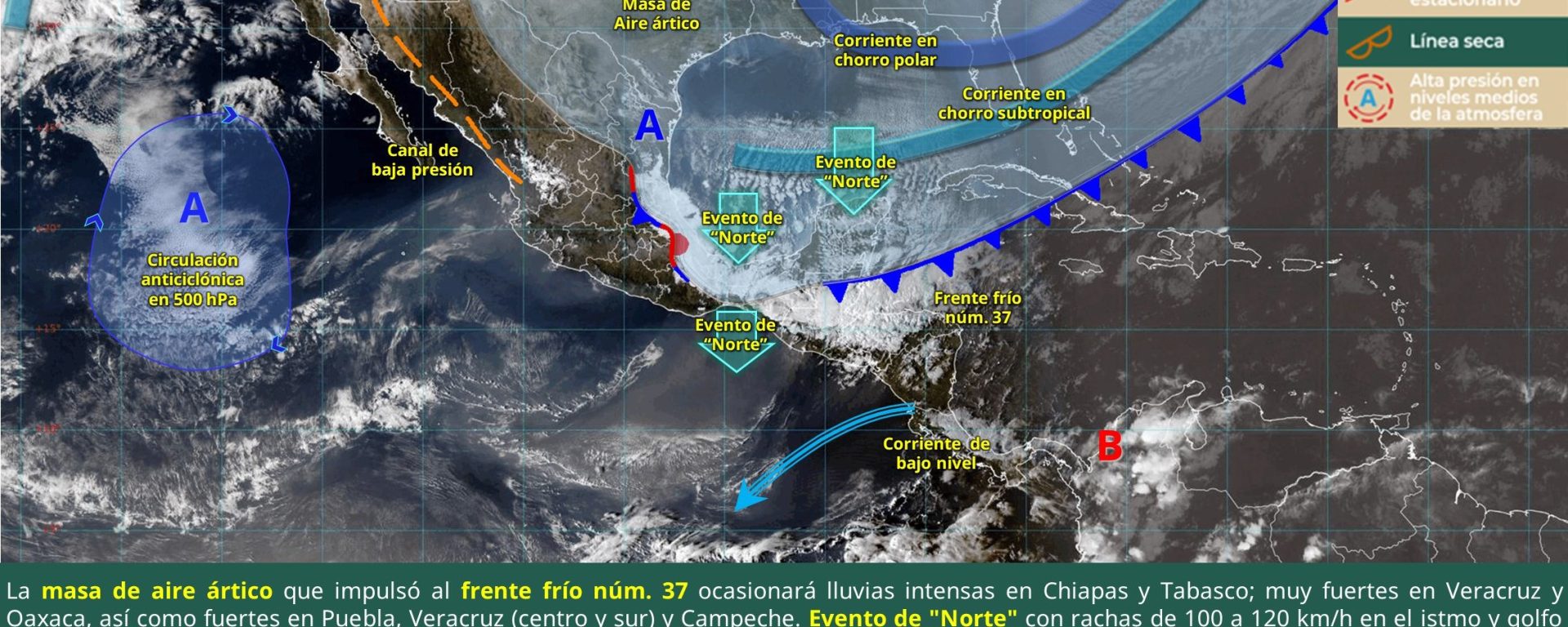 Viento de componente norte de 50 a 60 km/h con rachas de 80 a 100 km/h: istmo y golfo de Tehuantepec; de 10 a 20 km/h con rachas de 30 a 50 km/h: Campeche, Yucatán y Quintana Roo.