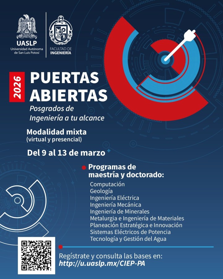 Del 9 al 13 de marzo de 2026, la Facultad de Ingeniería de la Universidad Autónoma de San Luis Potosí será sede de “Puertas Abiertas. Posgrados de Ingeniería a tu alcance”, actividad orientada a dar a conocer las líneas de investigación vinculadas con sus programas de maestría y doctorado, con el propósito de invitar a estudiantes de licenciatura y próximos egresados a continuar su formación académica.