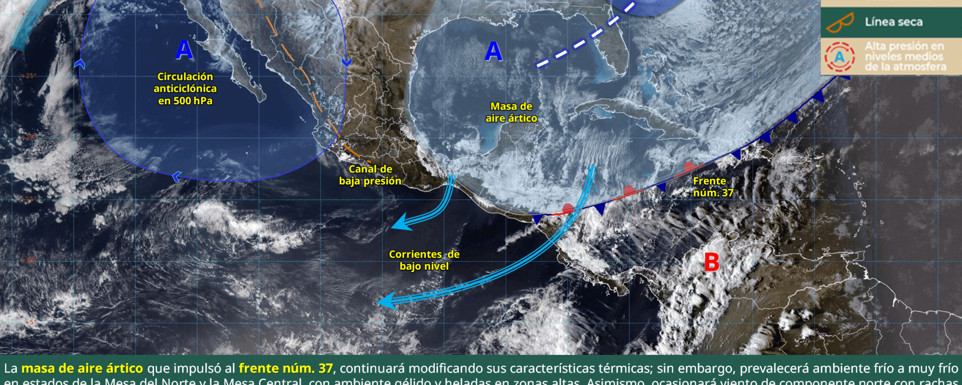 Temperaturas mínimas de -5 a 0 °C con heladas: zonas serranas de Coahuila, Nuevo León, San Luis Potosí, Zacatecas, Aguascalientes, Jalisco, Michoacán, Guanajuato, Estado de México, Hidalgo, Tlaxcala, Morelos, Puebla, Veracruz y Oaxaca.