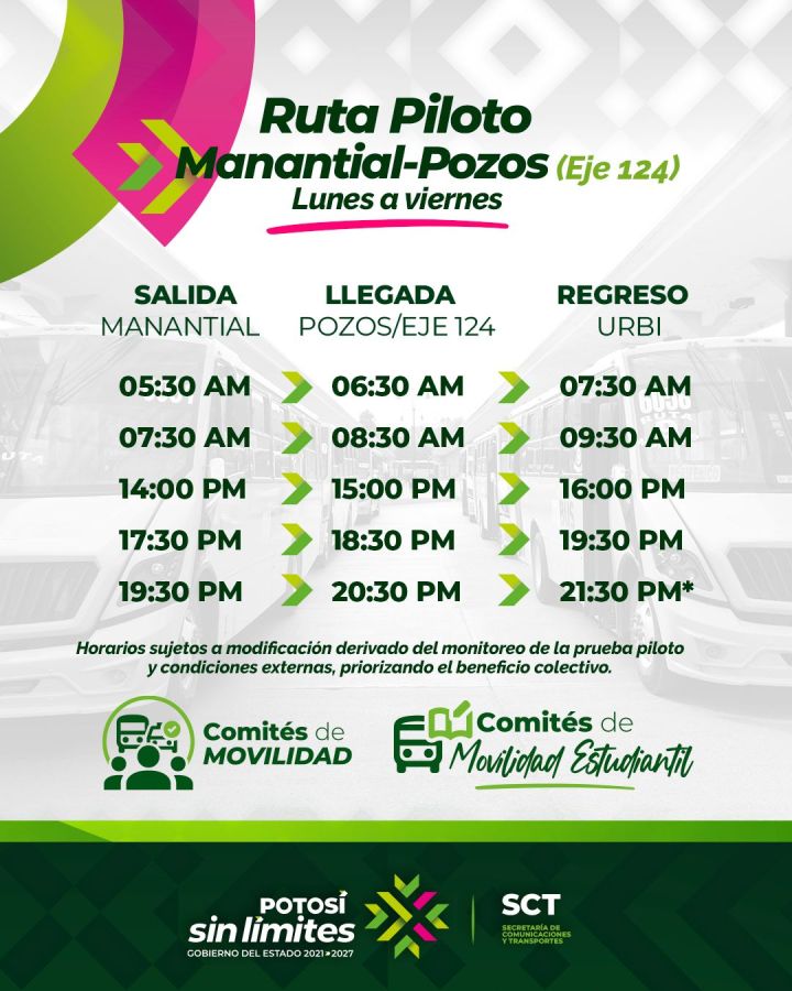 Siguiendo la instrucción del Gobernador Ricardo Gallardo Cardona, de fortalecer sin límites la movilidad y atender las necesidades ciudadanas, la Secretaría de Comunicaciones y Transportes (SCT) puso en marcha la prueba piloto de la nueva ruta que conectará Ciudad Satélite con Villa de Pozos. Esta acción forma parte del cambio que se vive y se siente, priorizando soluciones reales para mejorar la calidad de vida de las y los potosinos.