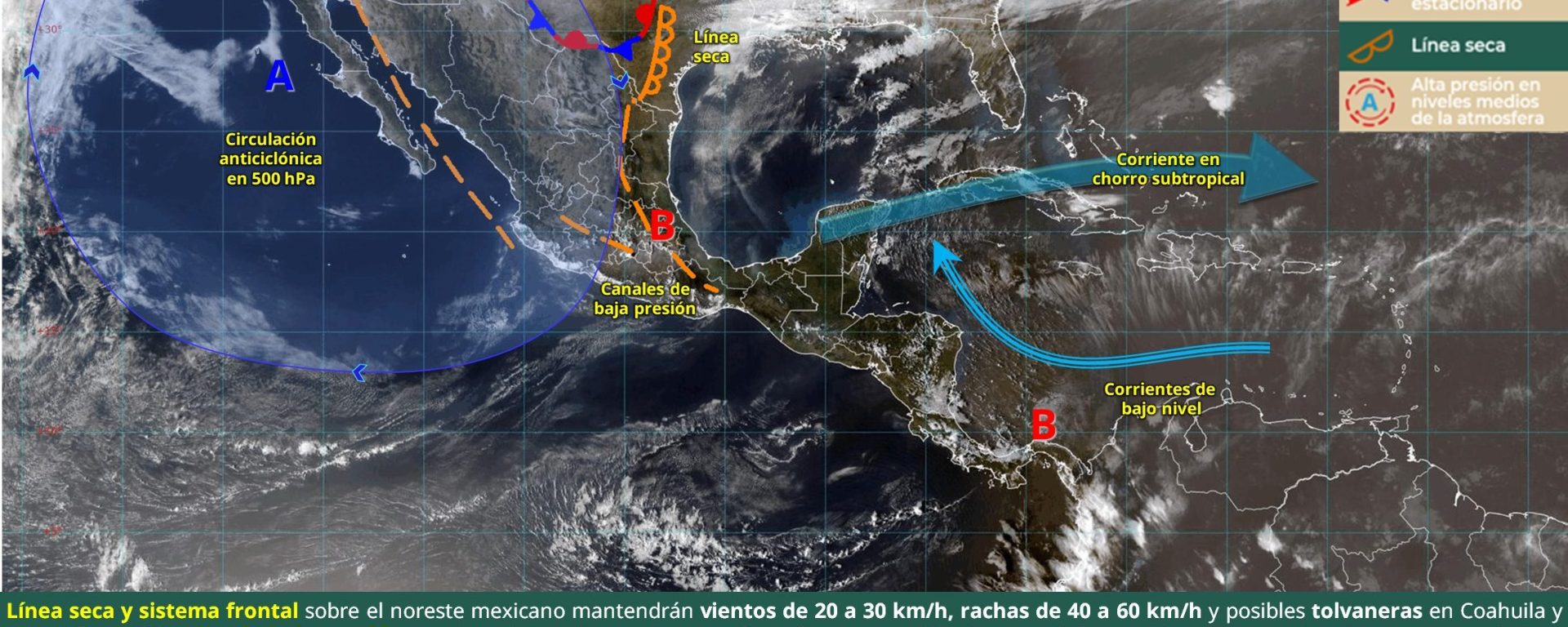 Viento de 10 a 20 km/h con rachas de 30 a 50 km/h: golfo de California, Baja California, Baja California Sur, Sonora, Durango, Sinaloa, Nayarit, Jalisco, Michoacán, Guerrero, Oaxaca, Chiapas, Coahuila, Nuevo León, Tamaulipas, San Luis Potosí, Zacatecas, Guanajuato, Querétaro, Hidalgo, Puebla, Tlaxcala, Estado de México, Ciudad de México, Campeche, Yucatán y Quintana Roo.